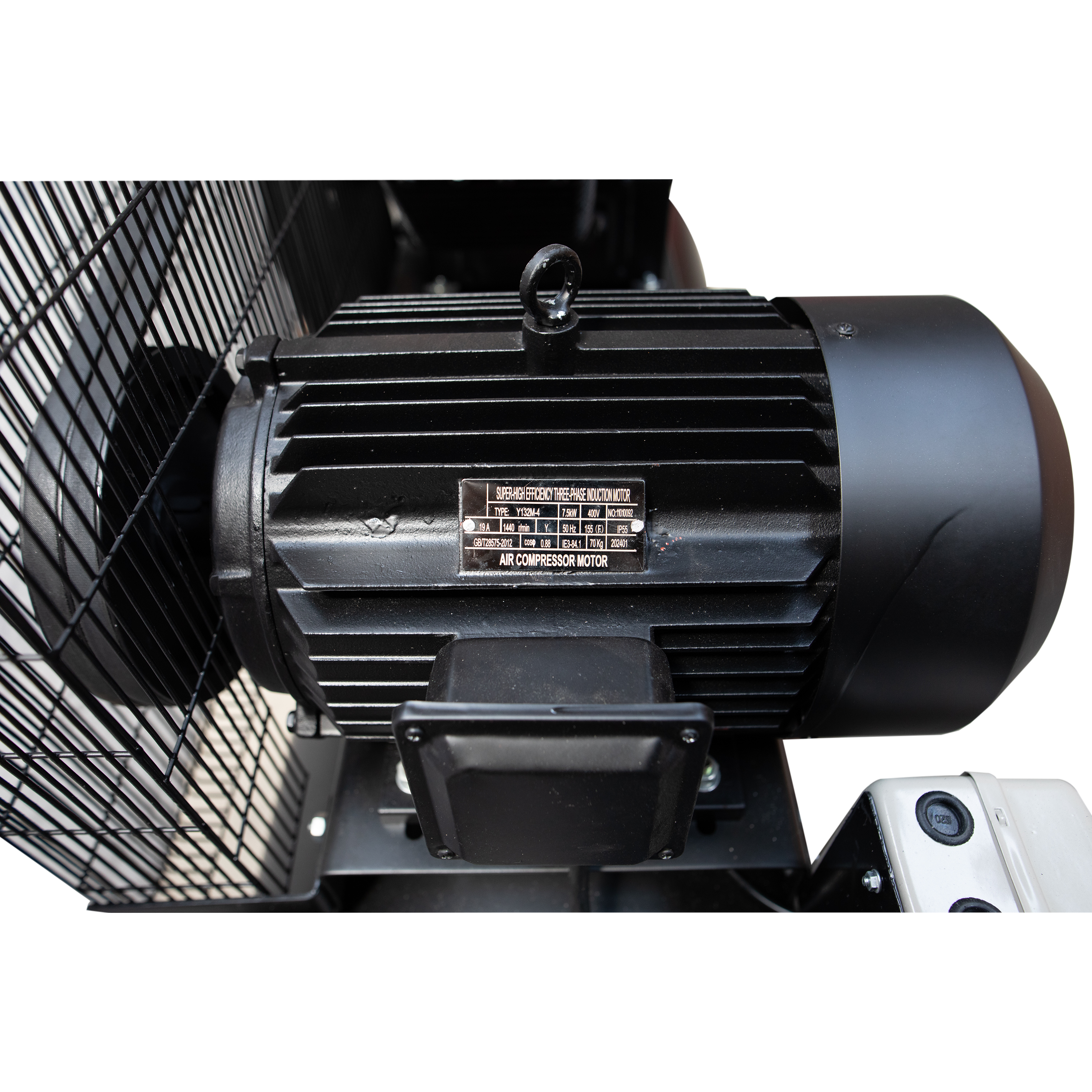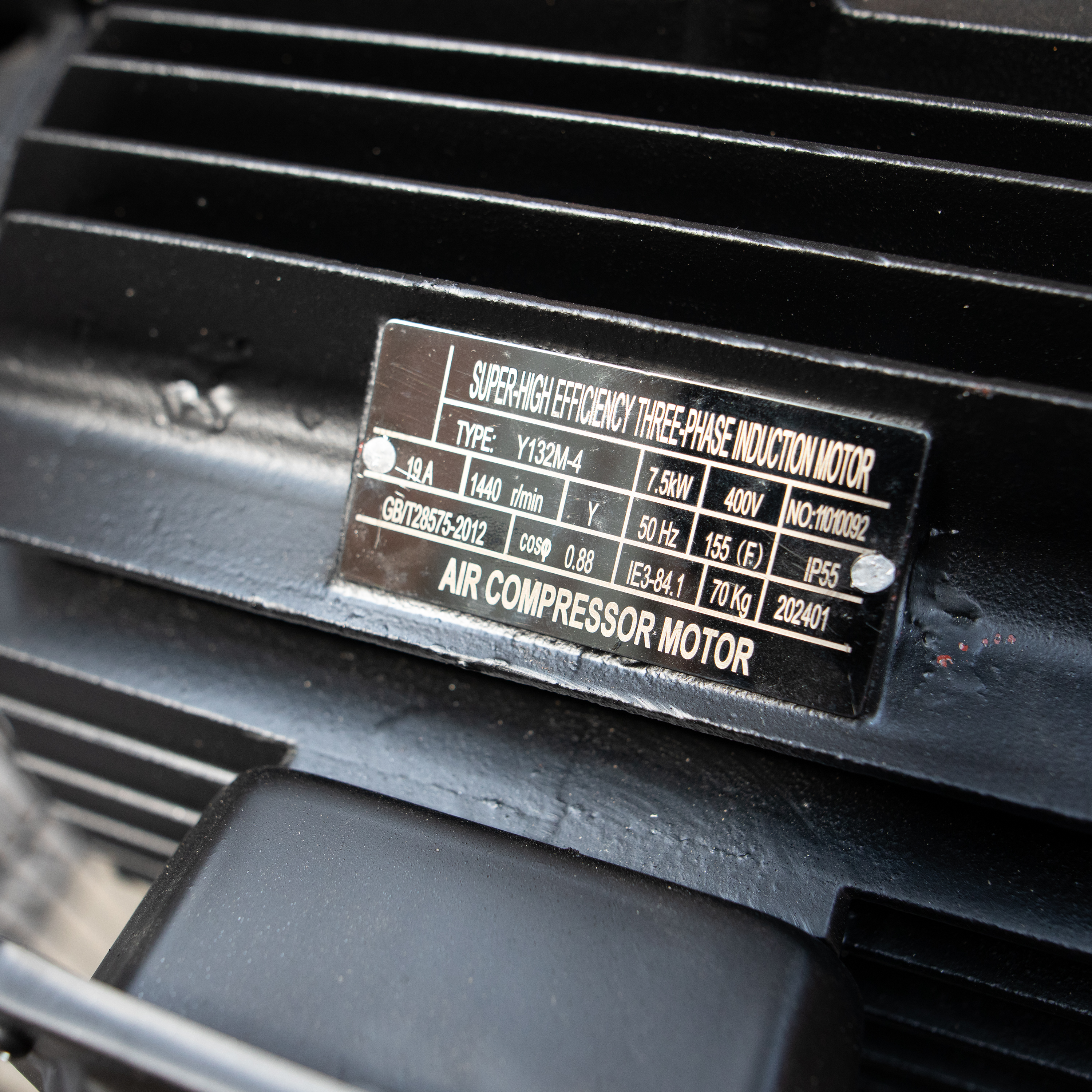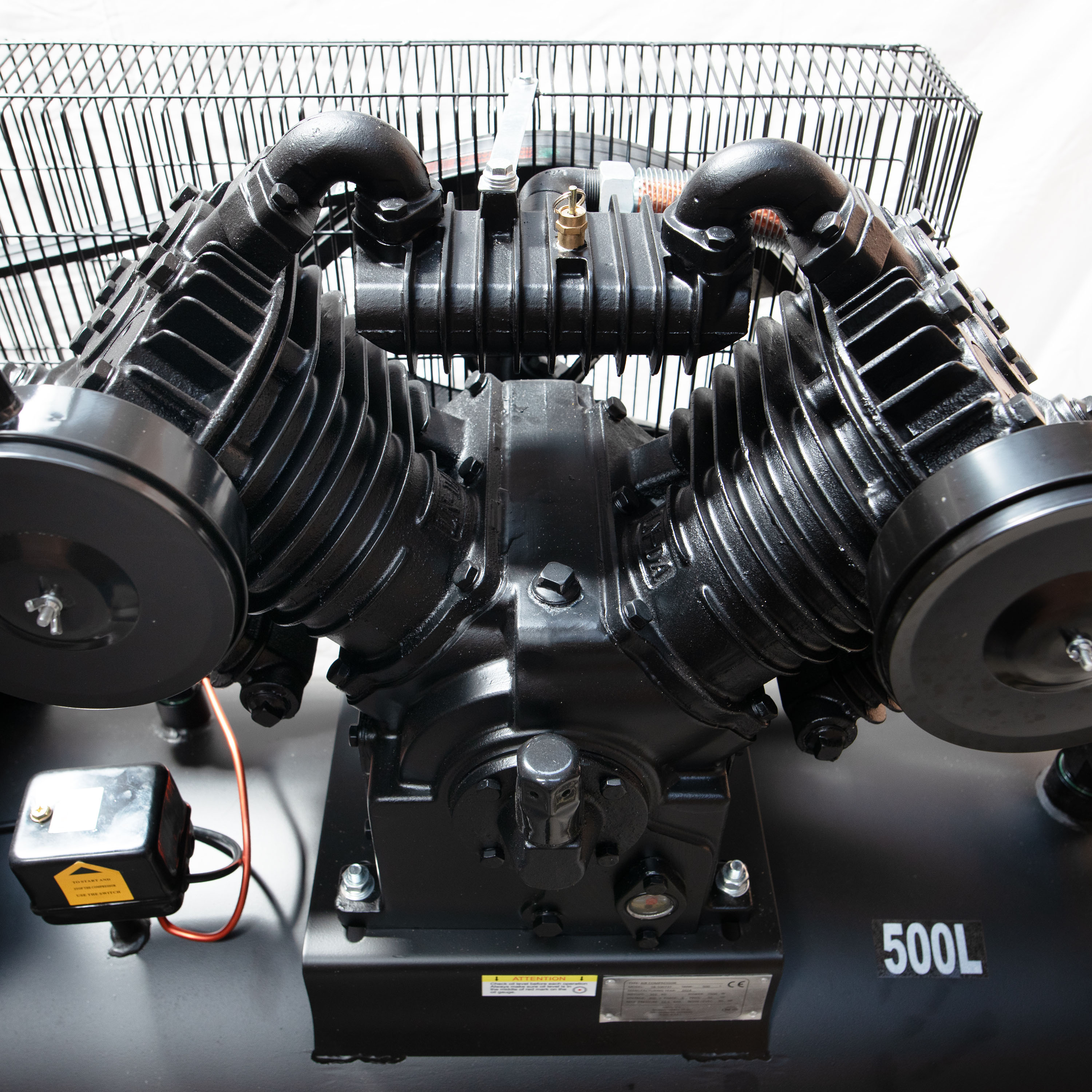 Der industrielle Luftkompressor verfügt über einen leistungsstarken 7,5 kW 4-poligen Motor mit Kupferwicklung und wird mit einer Stromversorgung von 400 V/50 Hz betrieben. Er verfügt über einen horizontalen Tank mit 500 Litern Fassungsvermögen und liefert 1200 Liter Luft pro Minute bei einer stabilen, niedrigen Drehzahl von 800 U/min, wodurch die Langlebigkeit der Pumpe gewährleistet wird.