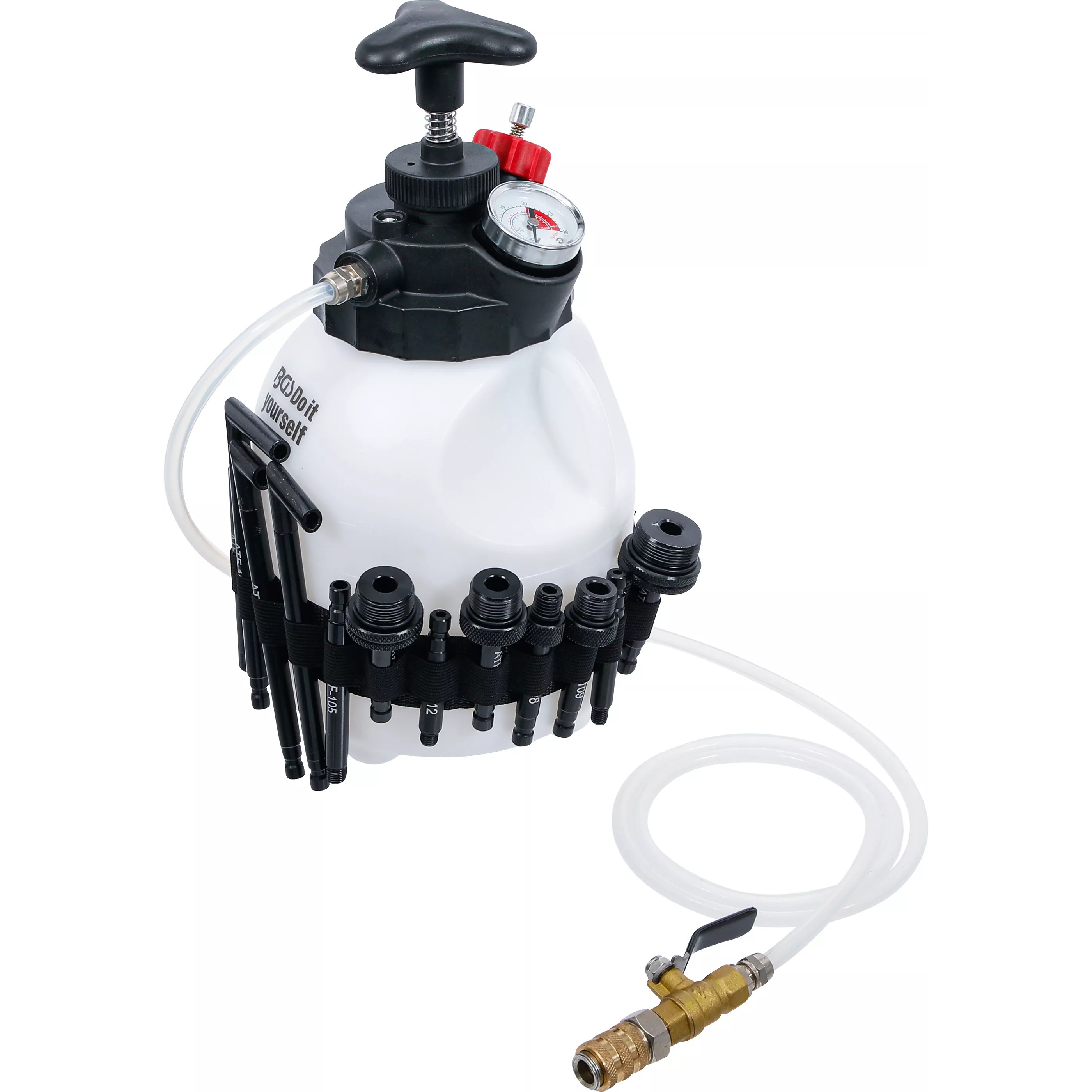 Enthalten sind 12 verschiedene Adapter, die eine Kompatibilität mit den meisten europäischen und asiatischen Fahrzeugherstellern gewährleisten. Der 1.5m Schlauch mit 7.5mm Durchmesser sorgt für Flexibilität bei der Anwendung. Das System ermöglicht einen Arbeitsdruck bis 0.7bar sowie einen Betriebsdruck von 1.5bar.