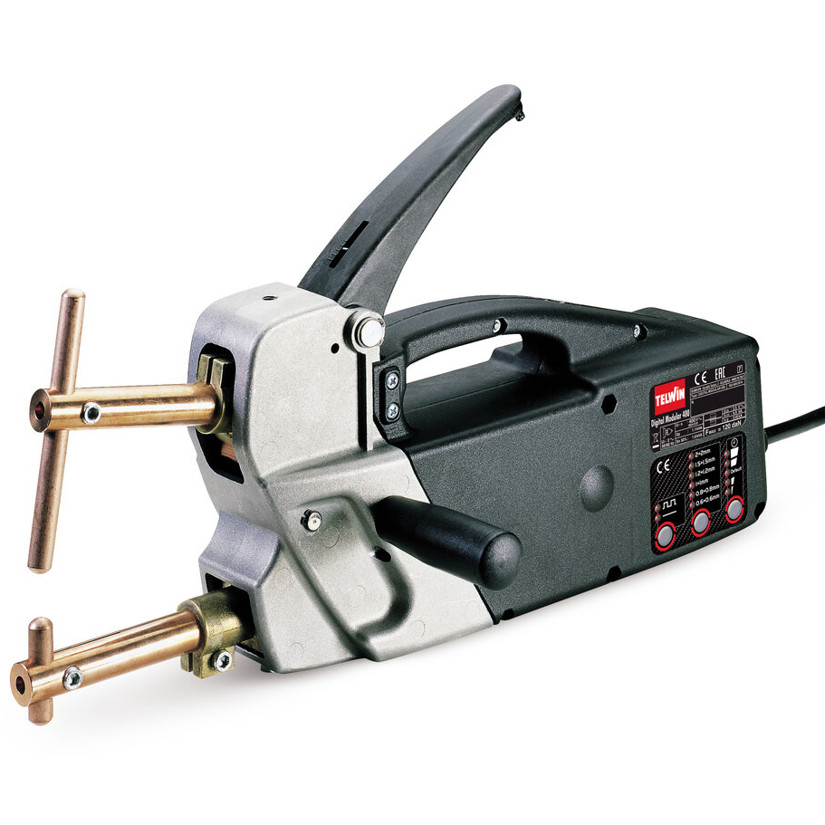 Microprocessor controlled, electronic spot-welding machine suitable for use in the car body repair. The digital, LCD, multifunction control panel allows the automatic regulation of spot welding parameters according to the chosen tool and sheet thickness.