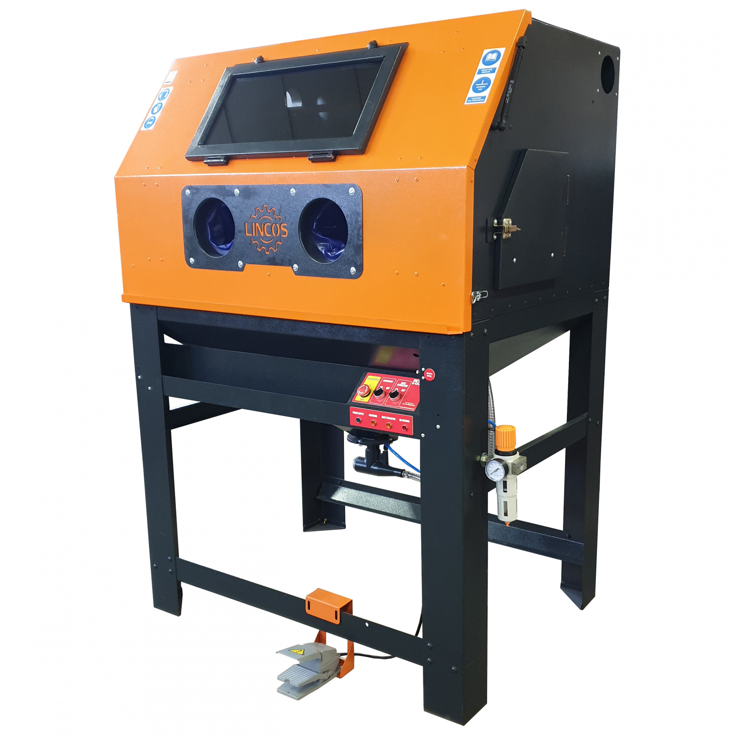 Blasting cabinet size 1200x900x700mm, lighting, cyclone tank, large front door, side doors, pedal-controlled blasting gun, max. 8.5bar, air consumption 400-700l/min