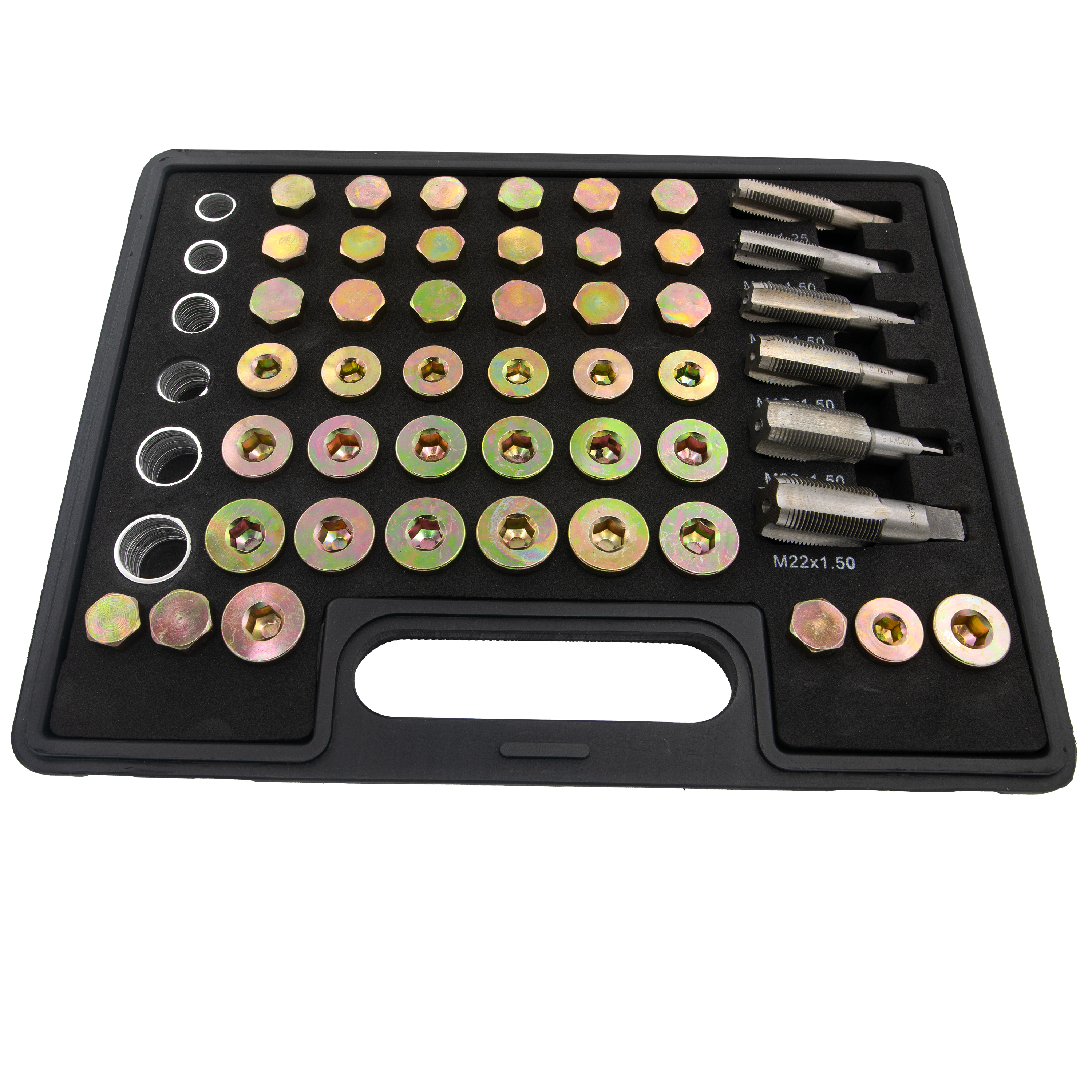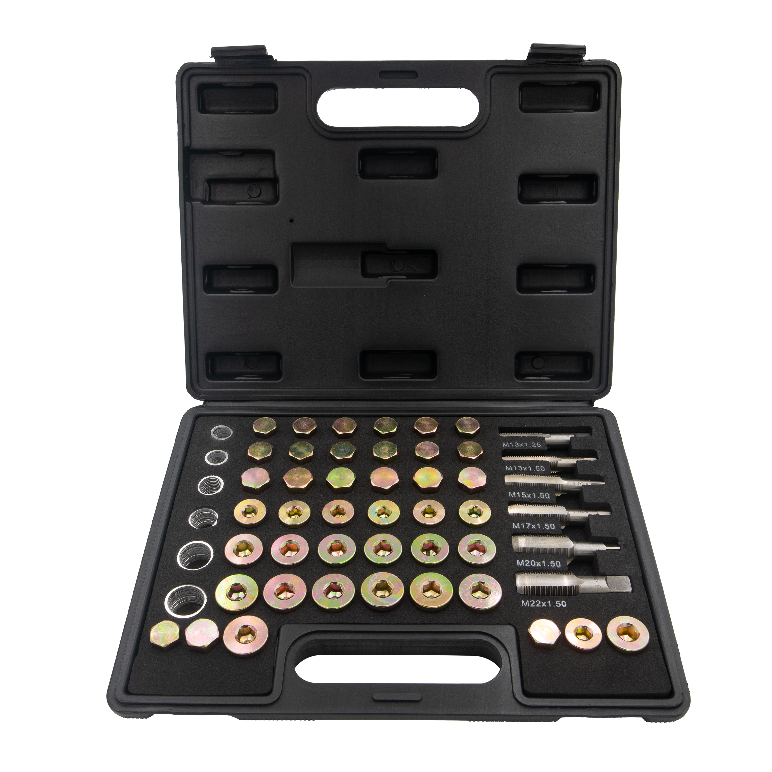 This is a complete 120-piece set designed for the efficient repair of damaged or stripped oil drain plug threads. This comprehensive kit includes everything needed to restore the integrity of oil drain systems.