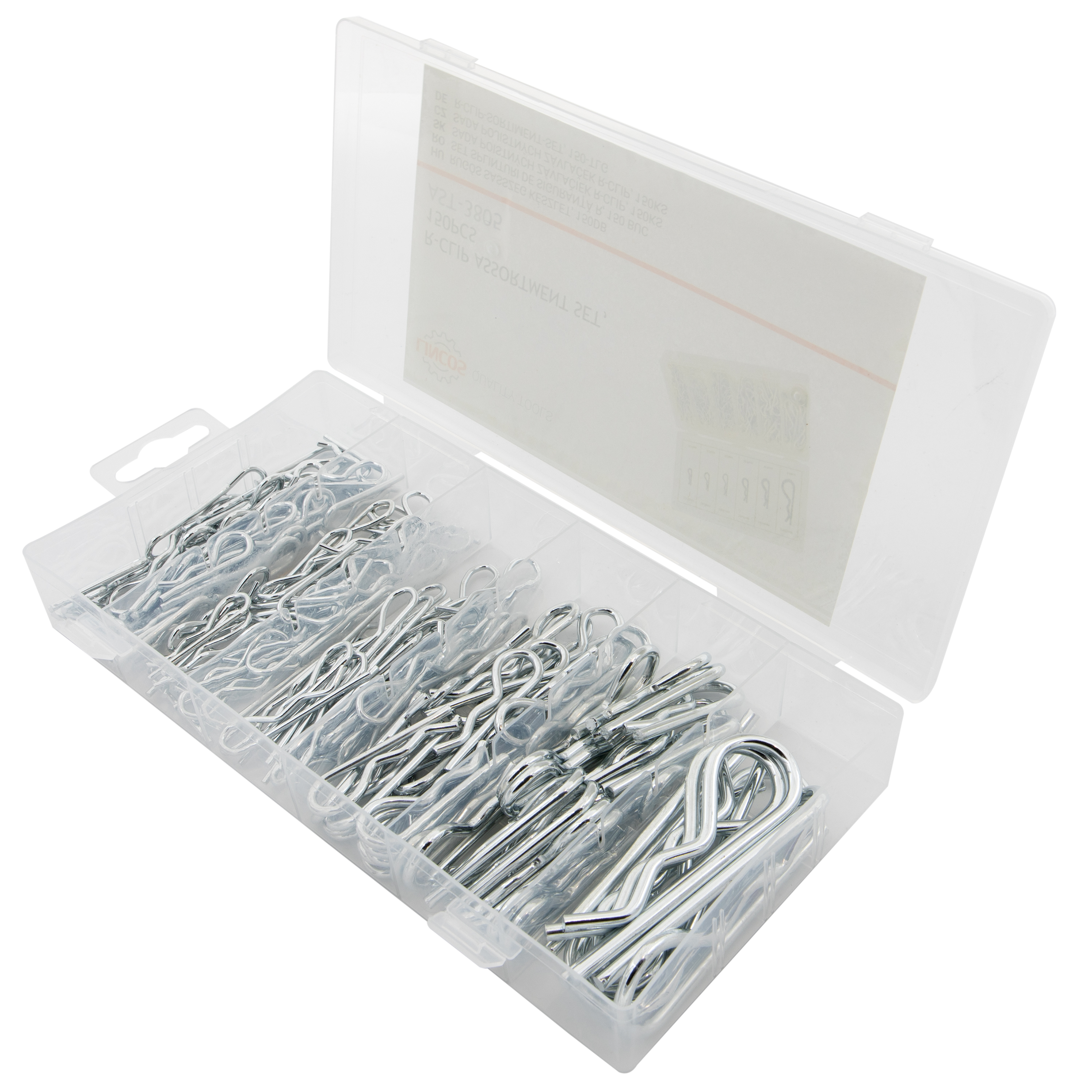 A 150-piece R-clip assortment set, including six different sizes (2.0mm - 3.9mm). Ideal for securing hitch pins, axles, and mechanical assemblies in automotive, agricultural, and industrial applications.
