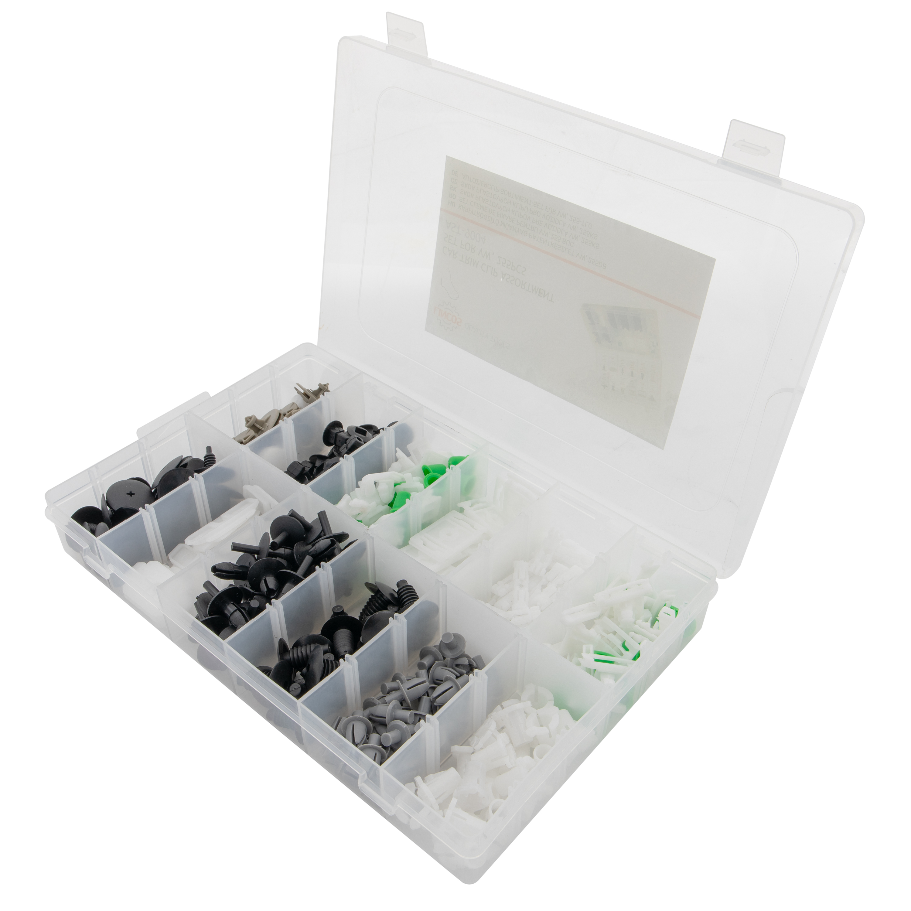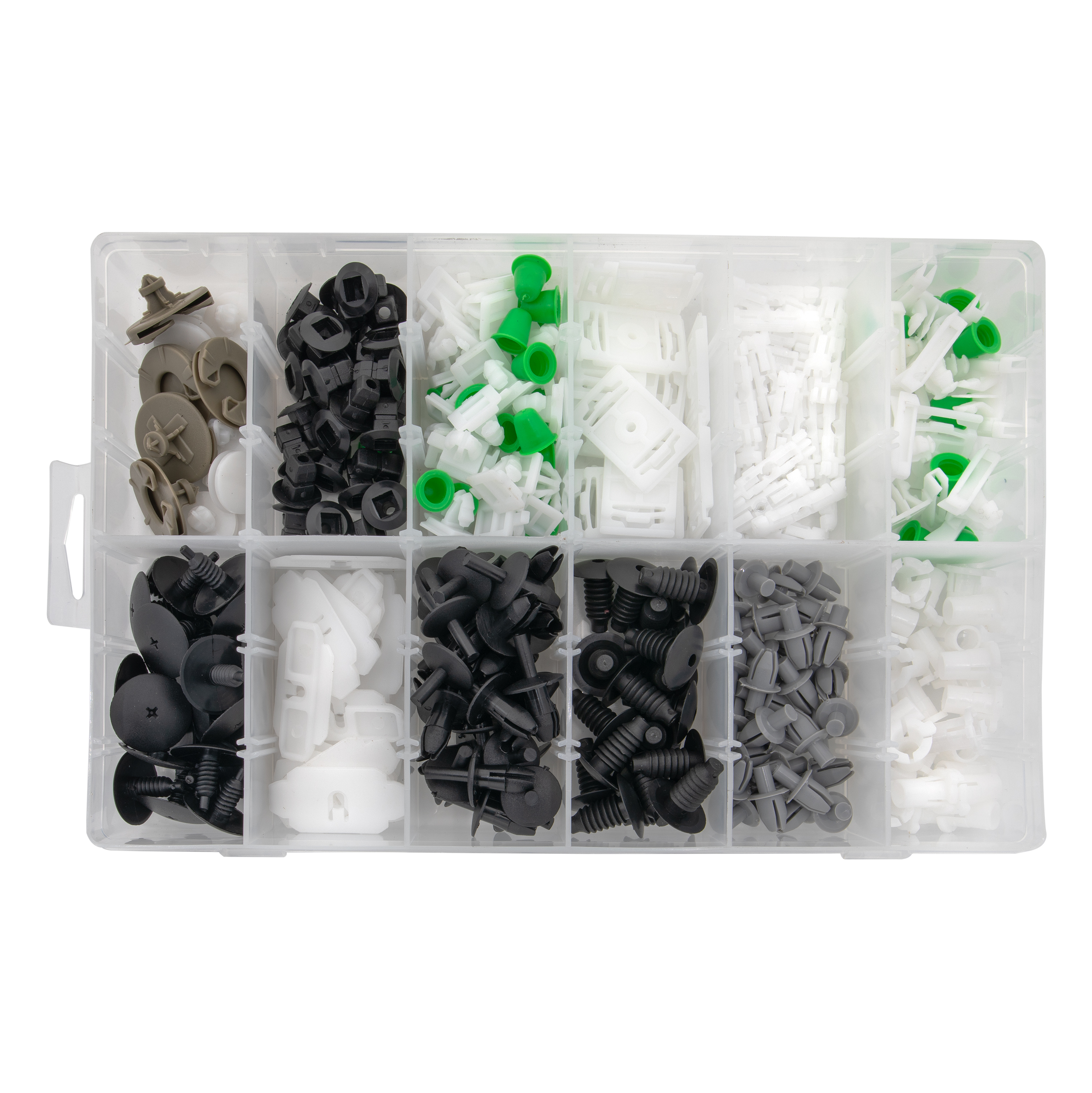The set includes various retainers, fasteners, and clips, making it perfect for automotive repairs and replacements. It comes in a practical plastic storage case for easy organization and access.