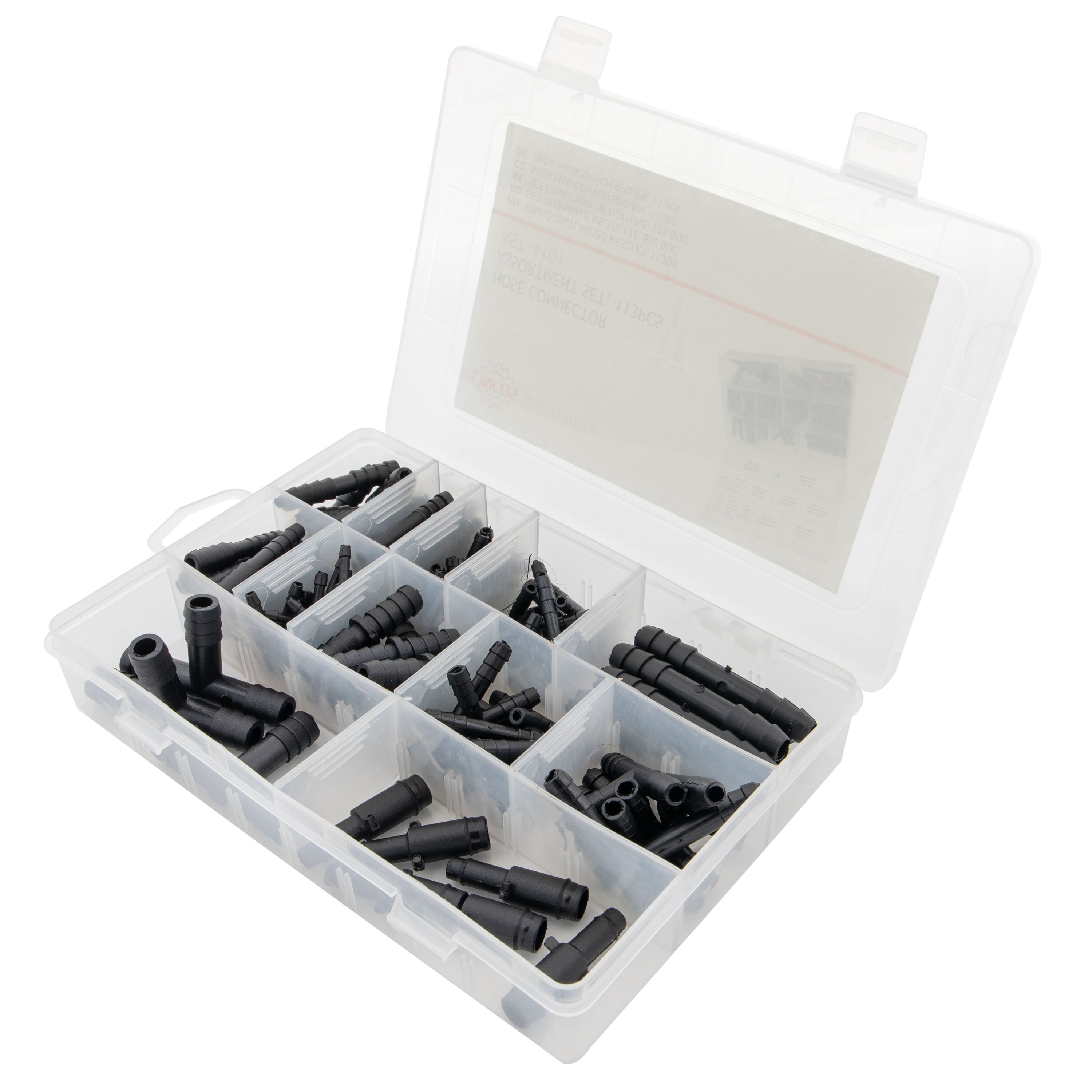This 113-piece hose connector assortment set is designed for securely connecting rubber or plastic hoses in various automotive, industrial, and household applications. The connectors are ideal for vacuum hoses, fuel return lines, coolant lines, and other low-pressure fluid transfer systems.