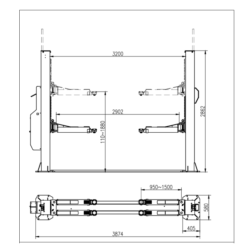 The 2-post lift is a result of in-house development, featuring a dual hydraulic cylinder system with synchronized movement via steel cables. It has a lifting capacity of 5,500kg and is powered by an electric motor driving the hydraulic pump, which distributes oil to the cylinders mounted inside the columns.